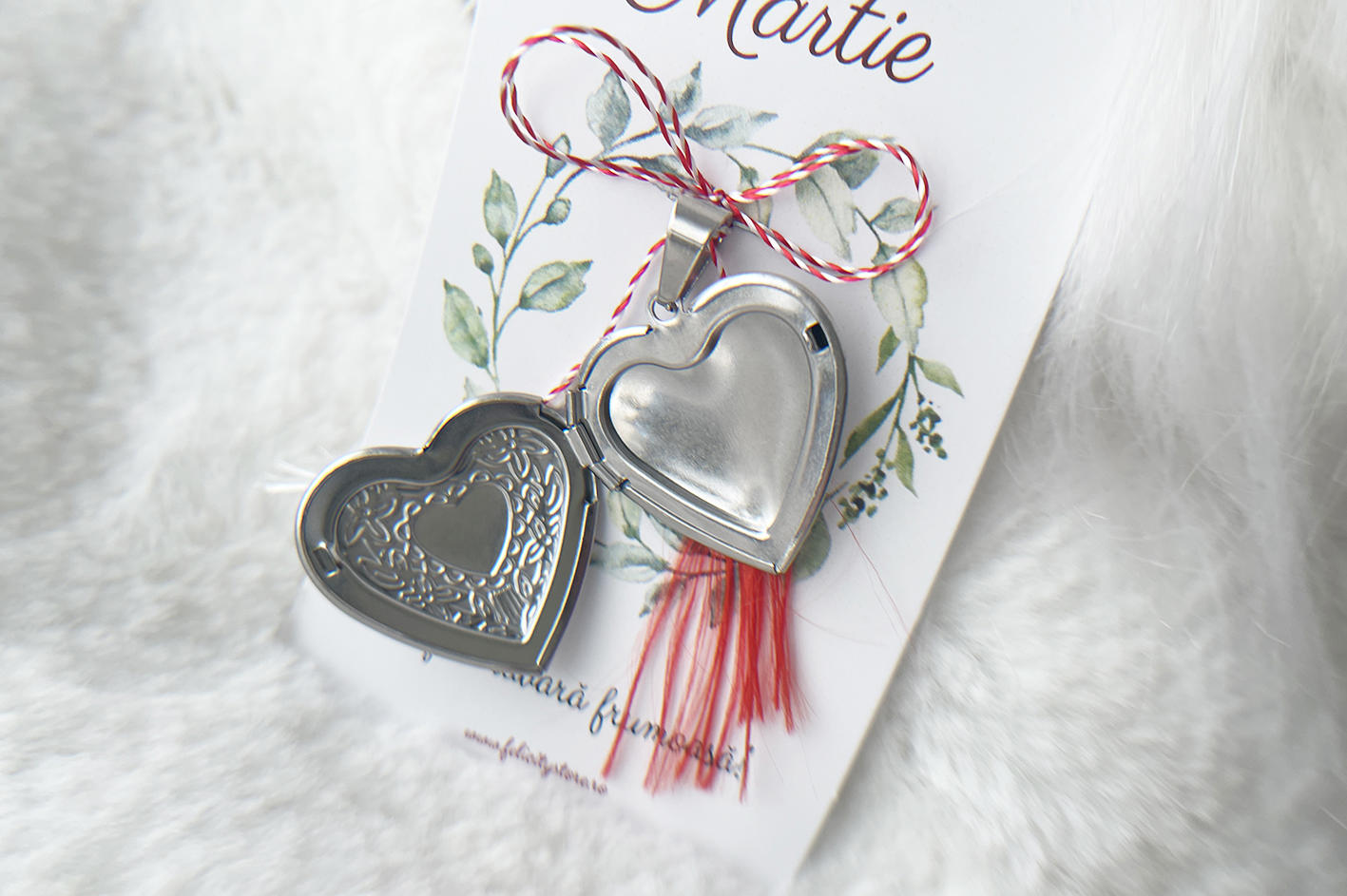 Medalionul în formă de inimioară măsoară aproximativ 2,8 cm fără sistem de prindere.