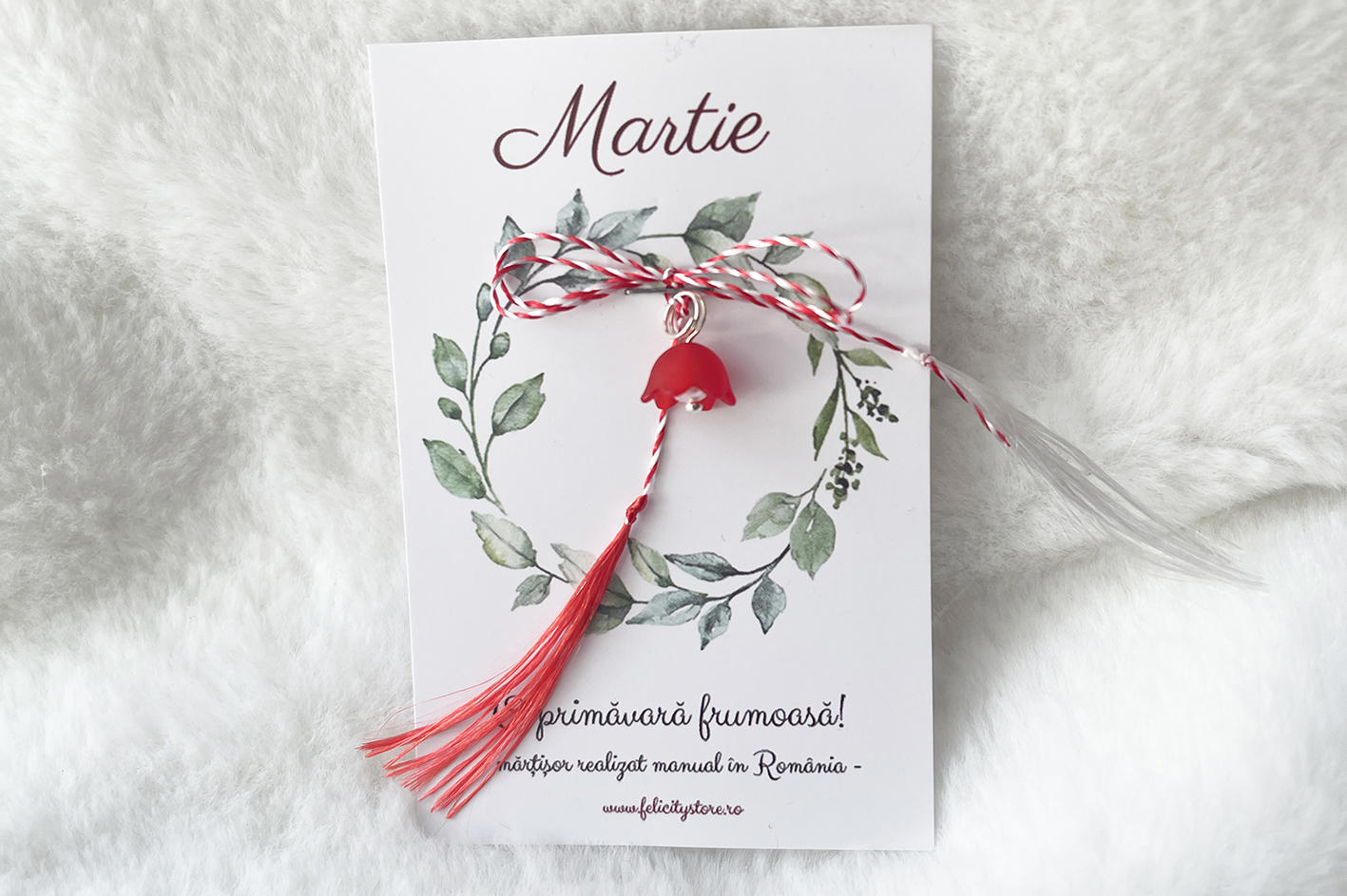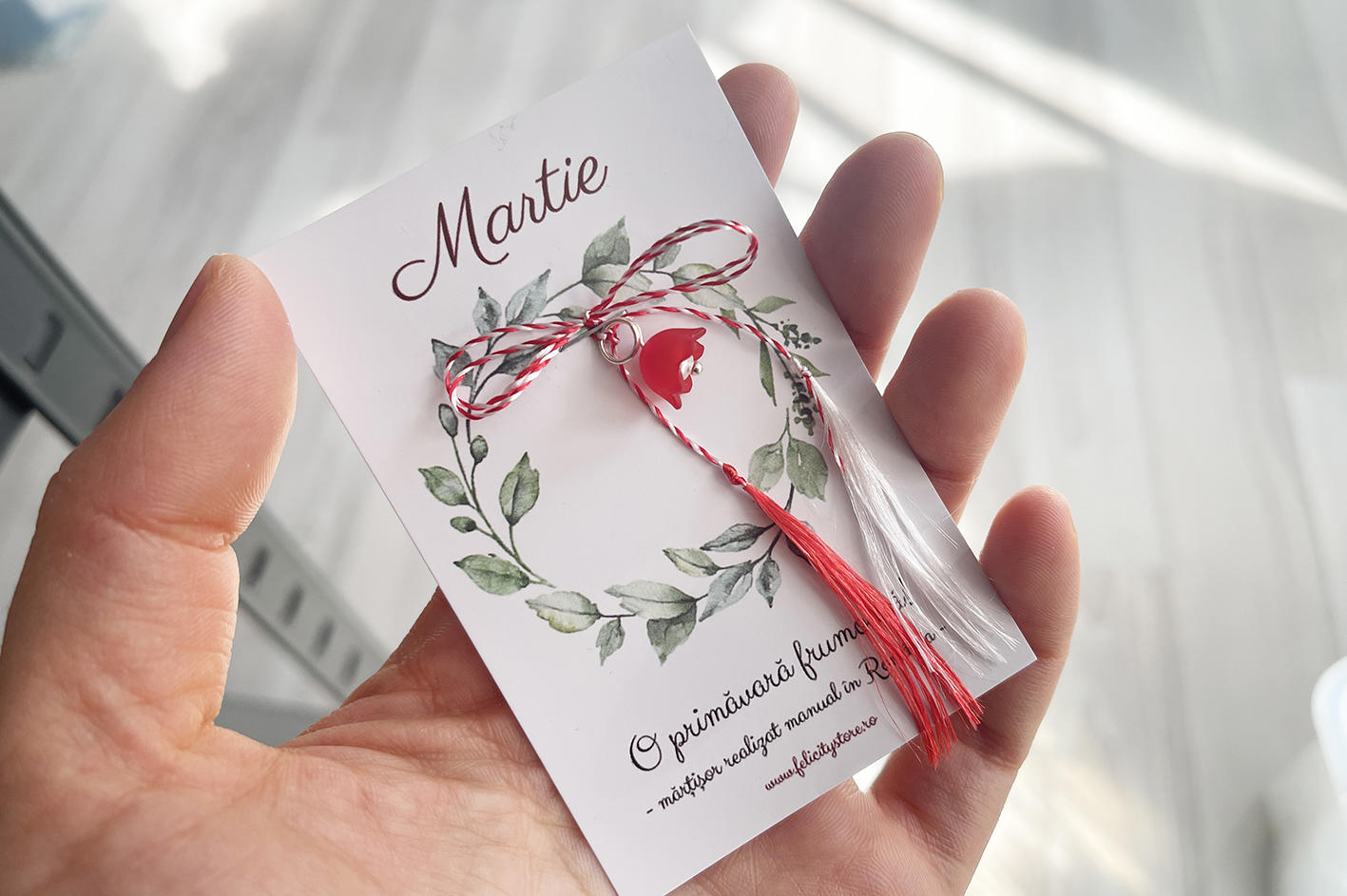 Textul de pe cartonaș, în partea de jos, poate diferi. Edițiile realizate începând cu anul 2026 poartă mențiunea „Mărțișor realizat manual în România”.